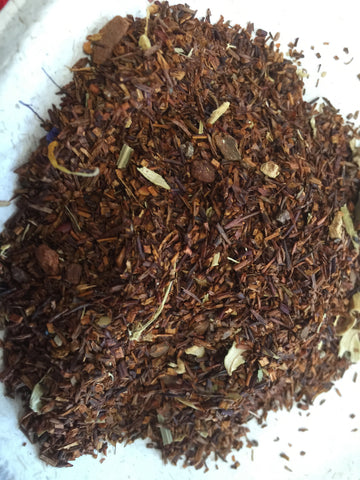 Made With Rooibos As Base Ginger root, cinnamon, green cardamom and cinnamon, ginger and vanilla flavor.